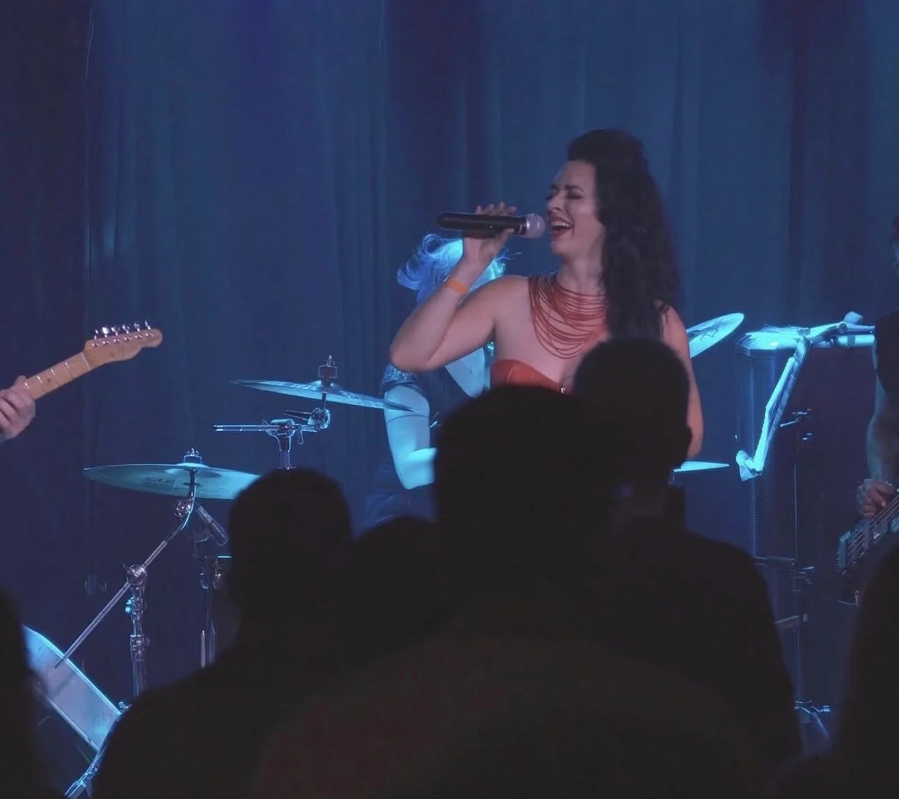 Performances are more than concerts — they are multimedia experiences incorporating live VR projections of hand-painted virtual environments, holography, and dance. The band brings this vision to life with atmospheric instrumentation and dynamic stage presence, with Cliff Aaron on drums and Jake Arnstein on bass. Choreographers and dancers Pink Supakarn and Kate Griffler — collaborators in the VR experiences and select live shows — extend the work into movement, dissolving the line between concert and total sensory experience.